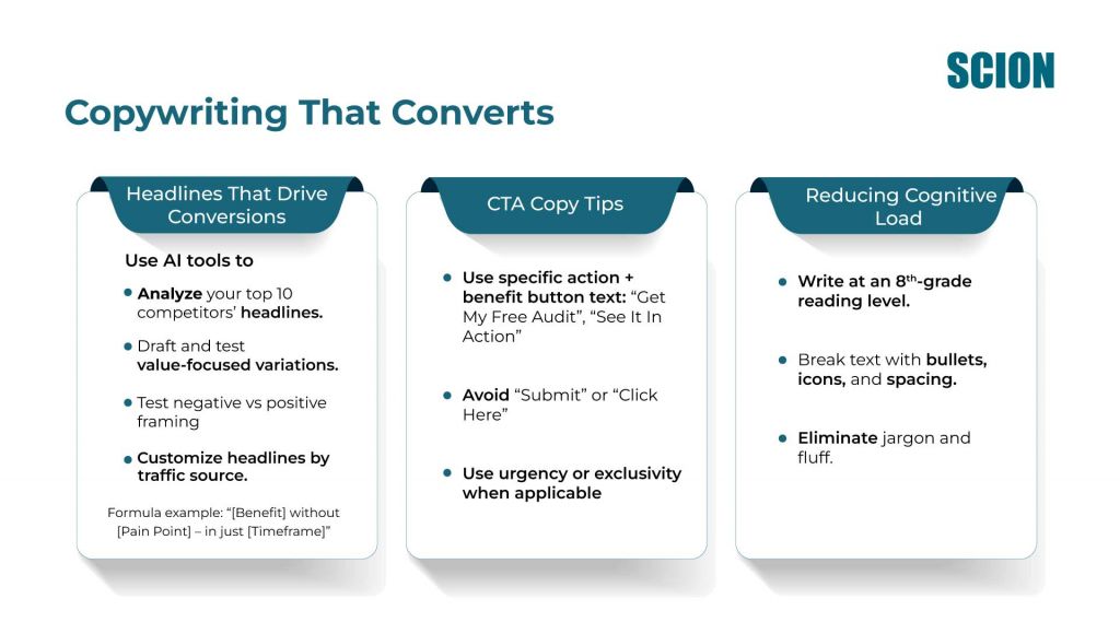 • Multivariate testing: If you have enough traffic, test combinations of headline, CTA, and visual together.