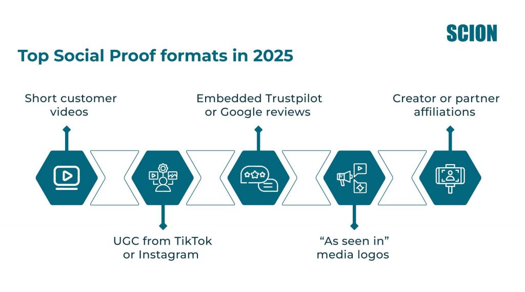 Modern users are skeptical, so you need credibility throughout the page. Reviews, badges, testimonials, media mentions, and transparent language reinforce trust at every step.